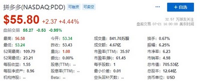 截至美东时间7月21日盘前交易,拼多多报55.80美元,涨4.44%,成交量841.70万股,成交额4.67亿美元,总市值705.53亿美元。