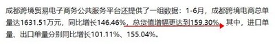 另据成都跨境贸易电子商务公共服务平台数据,今年1-6月,成都跨境电商总单量达1631.51万单,同比增长146.46%,总货值增幅更达到159.30%。其中,进口单量、出口单量分别同比增长101.11%、155.04%。