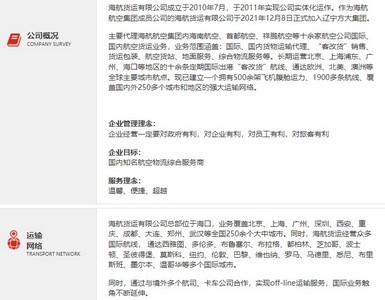 官网资料显示,海航货运有限公司成立于2010年7月,于2011年实现公司实体化运作。作为海航航空集团成员公司的海航货运有限公司于2021年12月8日正式加入辽宁方大集团。