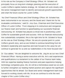 郭谨一介绍,随着公司的财务重组已经基本完成,现在是Schakel专注于首席战略官角色的最佳时机。我们正处于瑞幸咖啡增长故事的关键时刻,我们很高兴能继续受益于Schakel的领导和专业知识,并期待他在更专注的角色中继续为我们和我们的利益相关者创造价值。