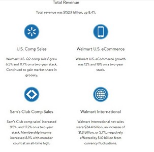 其中,沃尔玛美国第二季度的销售额连续两年增长6.5%和11.7%;沃尔玛美国电子商务的两年增长分别为12%和18%;山姆会员店销售额增长9.5%,两年累计增长17.2%。会员收入增长8.9%,会员人数创历史新高。