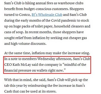 在周三下午给会员的一份报告中,山姆会员店首席执行官凯斯·麦克雷(Kath McLay)表示,该公司“注意到现在钱包面临的财务压力”。她表示,考虑到这一点,Sam's Club今年将通过报销可在其门店使用的Sam's Cash增加的费用来支付账单。