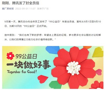 9月1日消息,腾讯总办向全体员工发布了“99公益日”年度全员信,宣布从9月1日至9月10日,为期10天的“99公益日”正式开始。今天,是2022年99公益日的第一天,腾讯推出“一花一梦想”新玩法,用户可以为自己心仪的公益议题捐出小红花,创造更多公益实践。