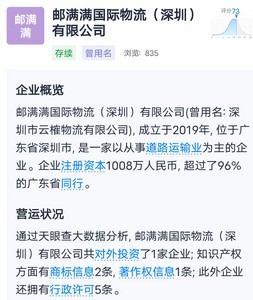 公开资料显示,云雀驿站是邮满满国际物流(深圳)有限公司旗下品牌,后者曾用名:深圳市云榷物流有限公司,公司成立于2019年, 位于广东省深圳市,是一家以从事道路运输业为主的企业。企业注册资本1008万人民币,法定代表人冯晓杰。经营范围包括从事装卸、搬运;物流信息咨询;国内贸易;经营进出口业务;普通货运;仓储服务;劳务派遣;预包装食品的销售。