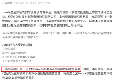 9月1日消息,云雀驿站8月31日宣布,即日起正式上线Jumia平台Global店铺代贴代发业务,目前开通东莞仓,可以代贴代发直邮模式和邮政小包运输渠道的店铺,每天送仓至Jumia华南区域的官方中转仓,。