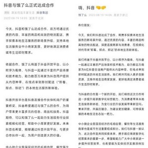 紧接着在19日,抖音和饿了么官宣合作。饿了么将基于抖音开放平台,以小程序为载体,和抖音一起携手探索本地生活服务的新场景升级,在视频化时代给消费者带来 " 即看、即点、即达 " 的本地生活新体验。