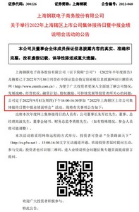 9月5日消息,上海钢联电子商务股份有限公司(以下简称上海钢联或公司)近日发布关于举行2022年上海辖区上市公司集体接待日暨中报业绩说明会活动的公告(以下简称公告)。