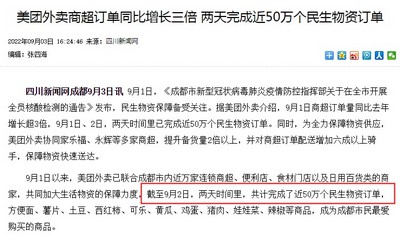 为保障运力的持续供应和稳定,9月1日18点至9月4日,美团在成都额外投入300万元配送补贴,用于发放疫情地区骑手保供配送奖励。同时,美团外卖还成立了骑手抗疫补给站,全面保障配送安全。骑手如遇到因疫情导致的异常订单,都可通过APP或上报站长进行沟通申诉,外卖平台将一律做免责处理。