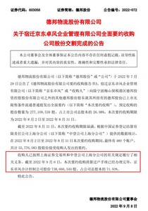9月7日消息,德邦物流股份有限公司(以下简称“德邦物流”)发布关于宿迁京东卓风企业管理有限公司全面要约收购公司股份交割完成的公告(以下简称“公告”)。
