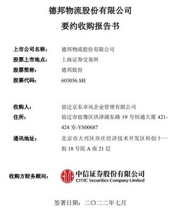 公告显示,2022年7月29日,德邦股份公告了《德邦物流股份有限公司要约收购报告书》,宿迁京东卓风企业管理有限公司(以下简称“京东卓风”或“收购人”)向除宁波梅山保税港区德邦投资控股股份有限公司之外的其他德邦股份股东就其所持有的德邦股份已上市无限售条件流通普通股发出全面要约(以下简称“本次要约收购”)。