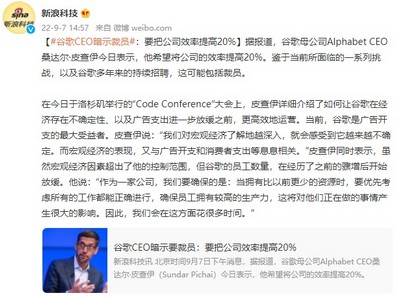 9月7日消息,有媒体报道称,谷歌母公司Alphabet首席执行官桑达尔·皮查伊在洛杉矶的Code Conference大会上表示,他希望将公司的效率提高20%。