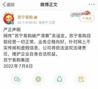 随即出现了苏宁破产清算的传闻。但苏宁方面很快出面辟谣。