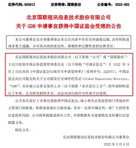 9月8日消息,北京国联视讯信息技术股份有限公司(以下简称国联股份或公司)日前发布关于GDR申请事宜获得中国证监会受理的公告(以下简称公告)。