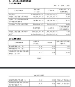 半年度报告显示,2022年上半年,公司营业收入约278.95亿元,同比增加98.76%;归属于上市公司股东的净利润约4.27亿元,同比增加97.70%;归属于上市公司股东的扣除非经常性损益的净利润3.85亿元,同比增长92.27%;基本每股收益0.86元,同比增加100%。