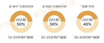 分年龄来看,16-25岁年轻用户偏爱含坚果元素的月饼,含“榛子”的月饼中16-25岁人群占比超50%;26-35岁用户偏爱含“阿胶”元素的月饼,该人群占比超50%;36-45岁用户偏爱“低糖”月饼,如低糖蛋黄白莲蓉、低糖松子仁莲蓉等人群占比均超40%。报告认为,更健康、高品质、高附加值产品正在成为月饼乃至整个食品行业的共性发展趋势。