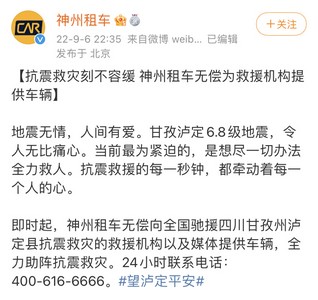针对受四川泸定地震影响的出行订单,神州租车宣布,启动适用于全国所有直营网点的震情应急保障政策,符合情况的用户,可以拨打24小时客服电话联系订单修改或减免等事宜。