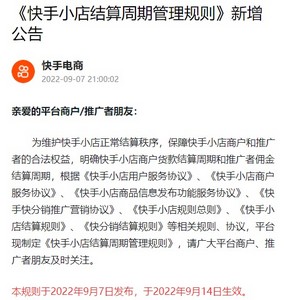 快手电商新增《快手小店结算周期管理规则》 9月14日生效
