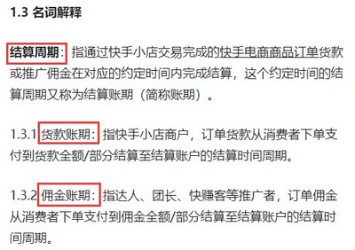 结算周期:指通过快手小店交易完成的快手电商商品订单货款或推广佣金在对应的约定时间内完成结算,这个约定时间的结算周期又称为结算账期(简称账期)。