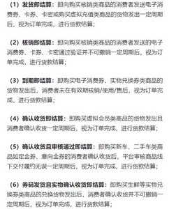 特殊业务如本地生活服务、虚拟卡券、实物兑换券、话费充值、电子会员、新车、二手车、拍卖、定金预售等,以及协议约定的其他结算周期,以具体业务规则及协议约定为准。包括但不限于:发货即结算、核销即结算、到期即结算、确认收货即结算、确认收货且审核通过即结算、券码发货且实物确认收货即结算。