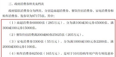 据了解,本次活动将面向州内消费者发放710万元政府银联消费券,共分为四类,其中商超消费券285万元、餐饮住宿消费券205万元、购车消费券165万元、家电消费券55万元。面额分别为:商超消费券60000张,分为满100减30元券45000张、满300减100元券15000张;餐饮住宿消费满200减80券25625张;家电消费券3300张,分为满1000减100元券2200张、满2000减300元券1100张;购车消费券8250张,是对于10月份购车用户的专项优惠补贴,给车主定向发送5张200元购车消费券。