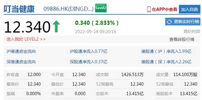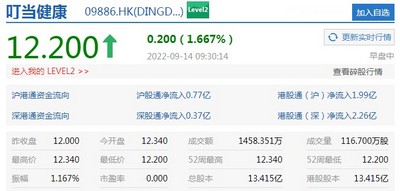 9月14日消息,医药电商叮当健康今日在港交所上市,开盘价12.340港元,较发行价上涨近3%。截至9月14日上午9点30分,叮当健康市值163.66亿港元,报价12.200港元。