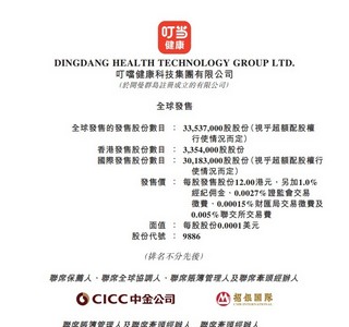 公告显示,叮当健康本次IPO预计发行3353.70万股,其中香港公开发售335.40万股,国际发售3018.30万股,另有超额配售503.05万股。发售价每股发售股份12.00港元,另加1.0%经纪佣金、0.0027%证监会交易征费、0.00015%财汇局交易征费及0.005%联交所交易费。
