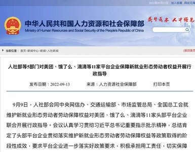 9月13日消息,人力资源和社会保障部会同中央网信办、交通运输部、市场监管总局、全国总工会就维护新就业形态劳动者劳动保障权益对美团、饿了么、滴滴等11家头部平台企业联合开展行政指导。