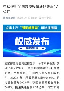 值得关注的是,昨日早间,国家邮政局发布消息,国家邮政局监测数据显示,今年中秋假期(9月10日-12日),全国邮政快递业运行总体安全、平稳有序,共揽收快递包裹8.52亿件,与2021年中秋假期相比增长0.24%,日均揽收量与2020年中秋国庆假期相比增长24.8%;投递快递包裹9.31亿件,与2021年中秋假期相比增长0.11%,日均投递量与2020年中秋国庆假期相比增长37.9%。