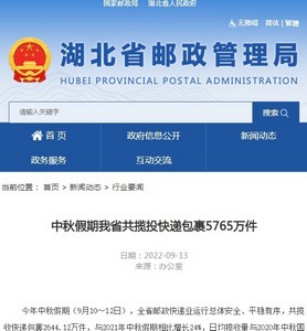 同日,湖北省邮政管理局也发布消息,今年中秋假期(9月10-12日),湖北省邮政快递业运行总体安全、平稳有序,共揽收快递包裹2644.12万件,与2021年中秋假期相比增长24%,日均揽收量与2020年中秋国庆假期相比增长51.8%;投递快递包裹3120.87万件,与2021年中秋假期相比增长11.4%,日均投递量与2020年中秋国庆假期相比增长30.5%。