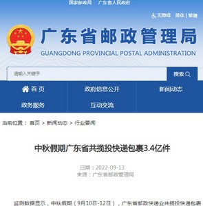 中秋假期广东省邮政快递业共揽投快递包裹3.4亿件