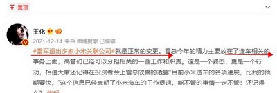 针对此事,小米公关部总经理王化转发了去年12月14日的一篇微博解释称,雷军于2021年便退出了多家关联公司的领导席位,王化表示这是正常的变更,雷军的精力主要放在了造车相关的事物上,高管们已经可以分担相关的一些公司和职责,再次表明小米造车工作的提速。