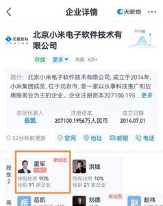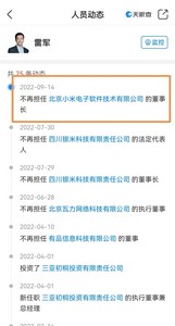 9月14日消息,天眼查信息显示,近日,天星数科关联公司北京小米电子软件技术有限公司发生工商变更,雷军卸任董事长,林斌卸任董事,洪锋卸任法定代表人、董事、经理,新增岳凯为法定代表人、执行董事、经理。