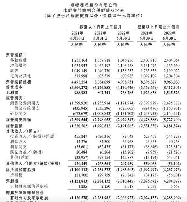 同样的,B站用户增长的同时,亏损面也进一步扩大。第二季度B站净亏损为20.1亿元,亏损同比扩大80%。今年上半年,B站累计亏损已经近43亿元,要知道,B站去年全年亏损也才68亿元。