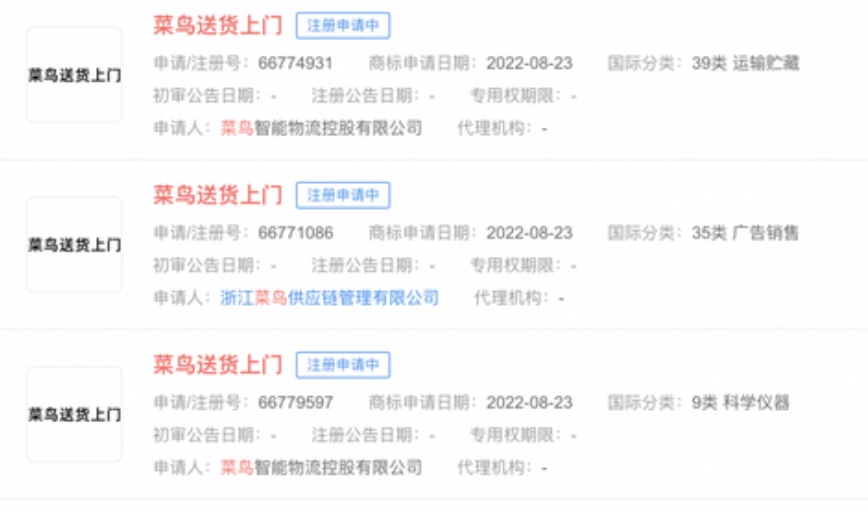 与此同时,阿里旗下的菜鸟抢先注册“菜鸟送货上门”商标,将“送货上门”同样提升到战略目标级别。企查查APP显示,菜鸟已于8月23日申请注册“菜鸟送货上门”商标,国际分类包含39类运输贮藏、42类设计研究等,商标状态为注册申请中。