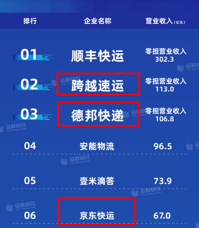 在排行榜中,第二名跨越速运,全年收入113亿元,第三名德邦快递,全年收入106.8亿元。而这两个巨头,已被京东收购并控股,再加上京东自身年入67亿的快运业务,目前京东系的零担快运收入已经达到286.8亿元,直逼行业第一顺丰快运。