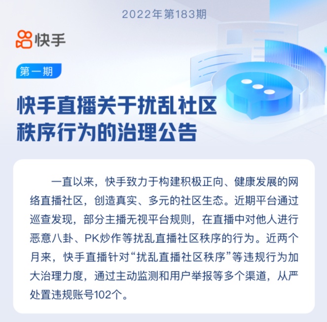 快手直播治理扰乱社区秩序行为 处置违规账号102个