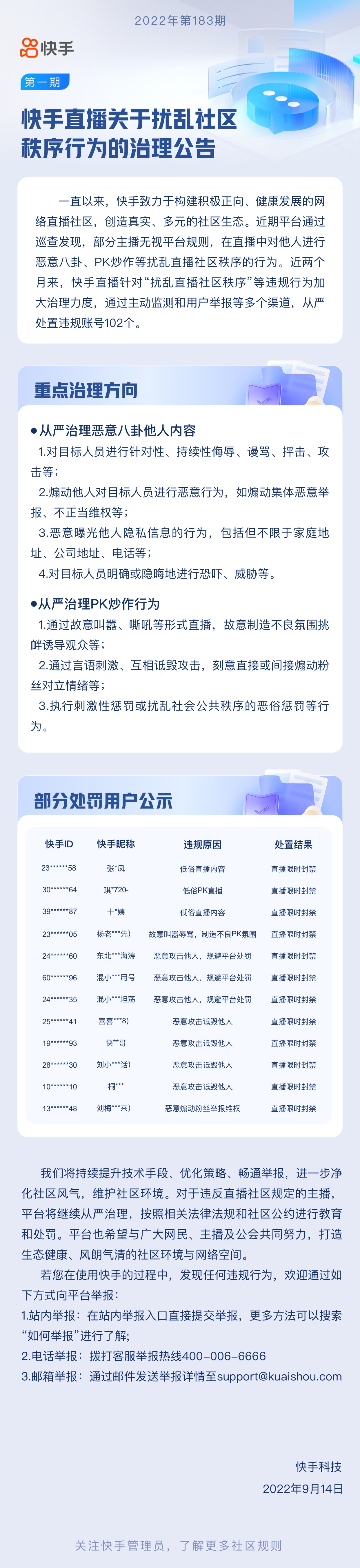 9月15日消息,快手日前发布快手直播关于扰乱社区秩序行为的治理公告。
