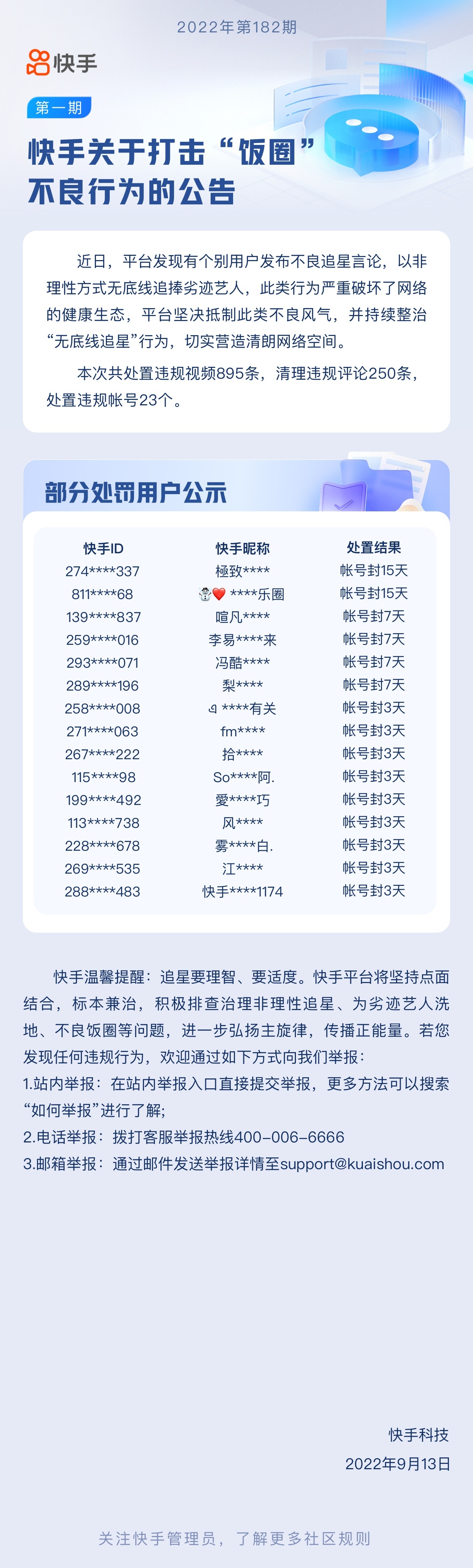 此次共处置违规视频895条,清理违规评论250条,处置违规帐号23个。