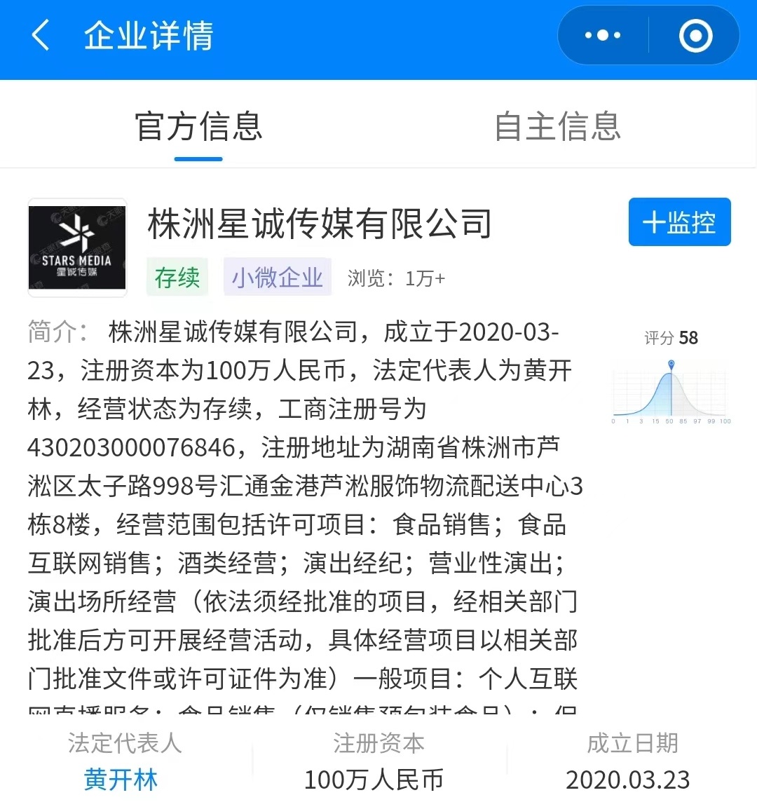 公司法定代表人为黄开林,注册资本100万人民币,经营范围含:个人互联网直播服务;食品销售(仅销售预包装食品);保健食品(预包装)销售;农副产品销售;宠物食品及用品批发;日用品销售;日用杂品销售;母婴用品销售等。