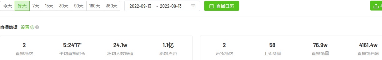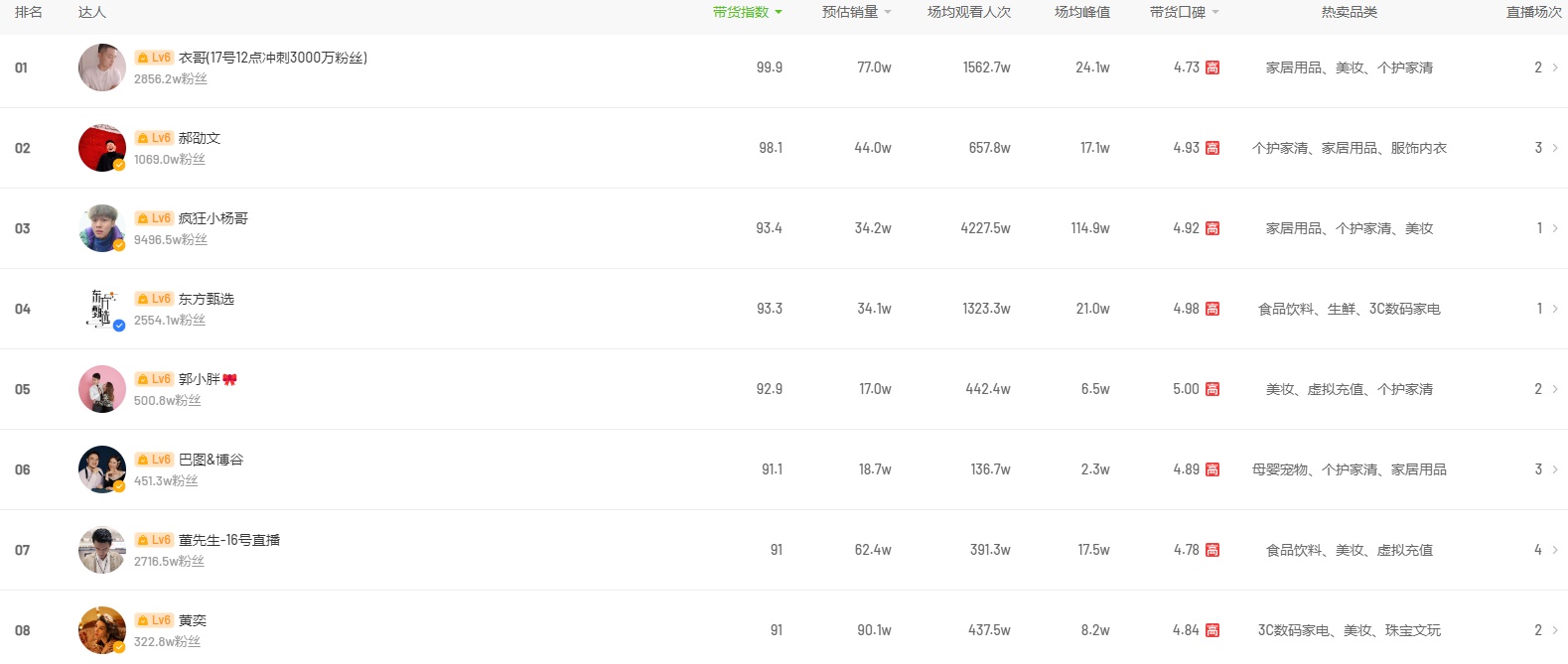 9月13日抖音带货榜 衣哥以4161.4万GMV登榜首