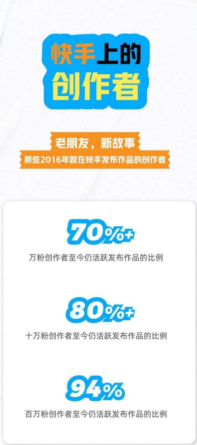 其中,2016年就在快手发布作品的创作者中,万粉、十万粉创作者到今天还在活跃发布作品的比例分别超过70%和80%,百万粉创作者的创作活跃比例达到94%。