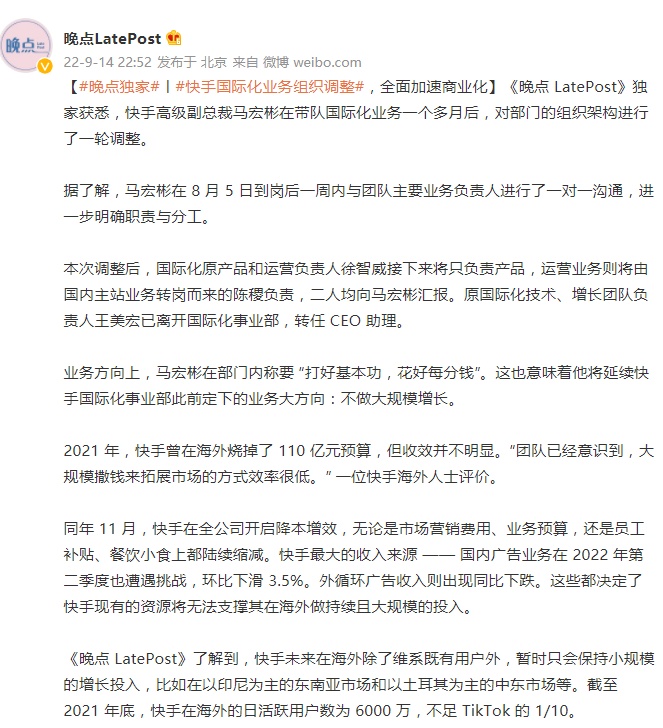 9月15日消息,据《晚点 LatePost》消息,快手高级副总裁马宏彬在带队国际化业务一个多月后,对部门的组织架构进行了一轮调整。马宏彬在8月5日到岗后一周内与团队主要业务负责人进行了一对一沟通,进一步明确职责与分工。