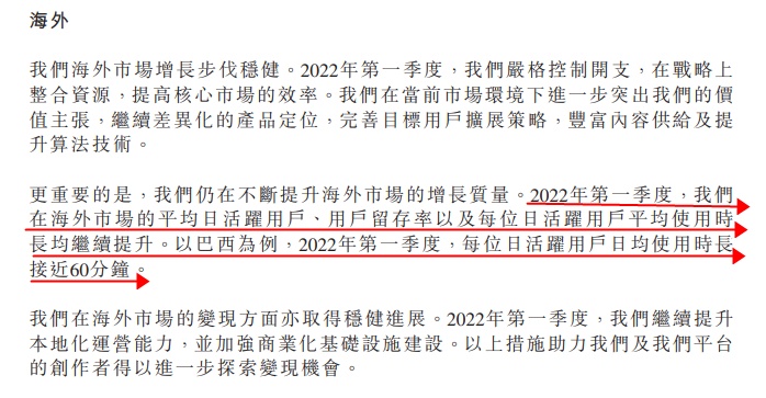 而快手2022年第一季度财报显示,快手在该季度严格控制开支,在战略上整合资源,提高核心市场的效率。2022年第一季度,快手在海外市场的平均日活跃用户、用户留存率以及每位日活跃用户平均使用时长均继续提升。以巴西为例,2022年第一季度,每位日活跃用户日均使用时长接近60分钟。