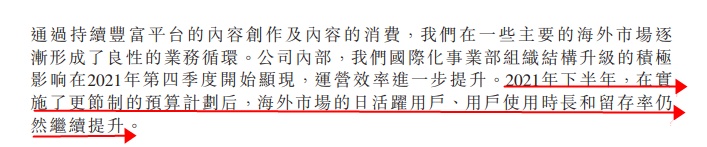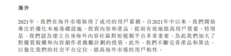 值得关注的是,快手在2021年度财报中指出,自2021年中以来,快手开始专注于优化本地基础设施,投资内容和产品。公司内部,快手国际化事业部组织结构升级的积极影响在2021年第四季度开始显现,运营效率进一步提升。2021年下半年,在实施了更节制的预算计划后,海外市场的日活跃用户、用户使用时长和留存率实现继续提升。