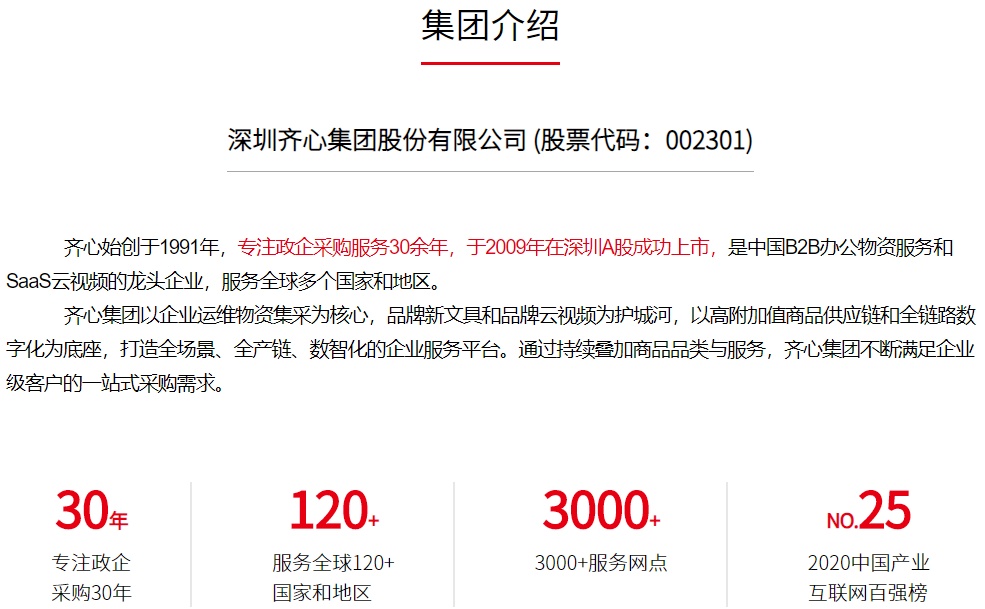 据官方介绍,齐心始创于1991年,专注政企采购服务30余年,于2009年在深圳A股成功上市,是中国B2B办公物资服务和SaaS云视频的龙头企业,服务全球多个国家和地区。