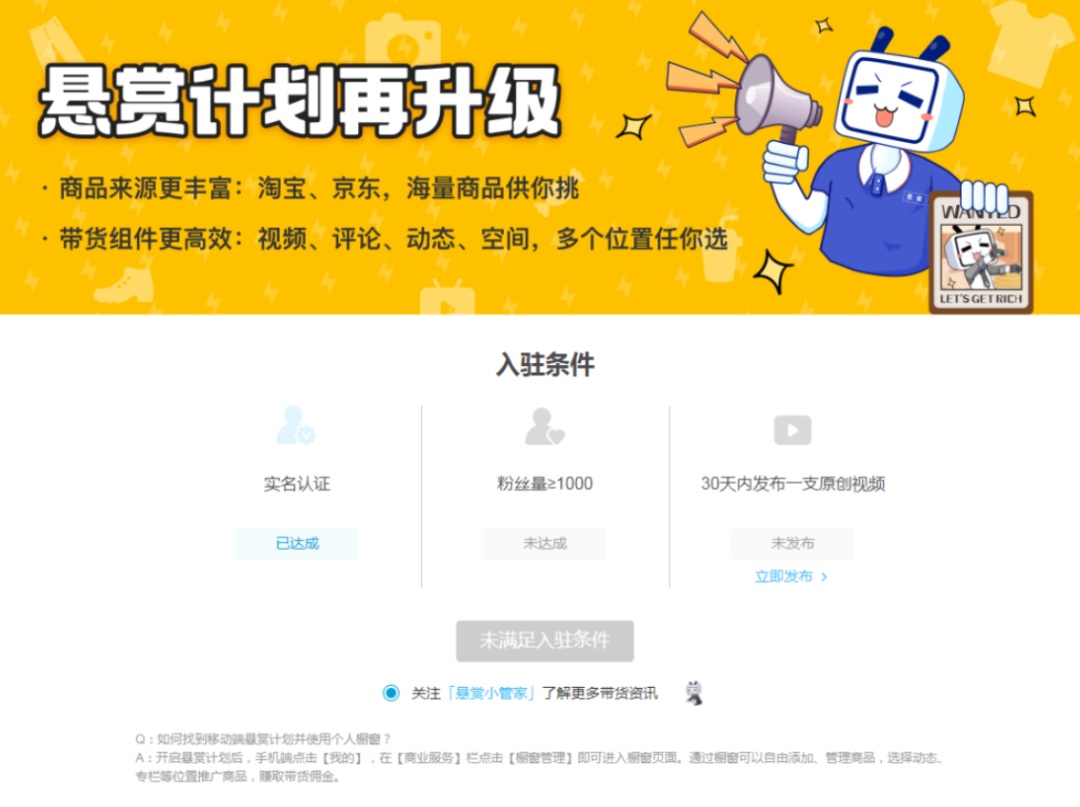2020年7月,B站宣布对“悬赏计划”再升级,不再局限于淘宝,京东的商品也能够选择;带货链接也不只是局限于直播或者视频中,评论、动态都能带货。而带货的账号只需满足:实名认证、粉丝量大于1000、30天内发布一支原创视频即可。