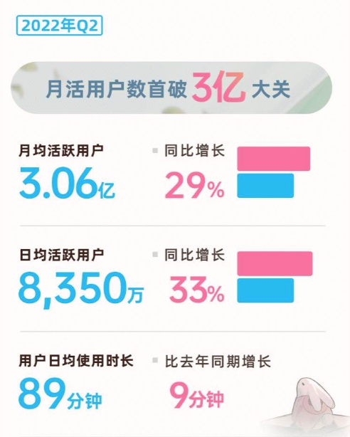 从B站二季度的财报中能够看到,截至2022年第二季度,B站月均活跃用户数达3.06亿,同比增长29%,且用户日均使用时长达89分钟,社区整体流量同比增长48%。