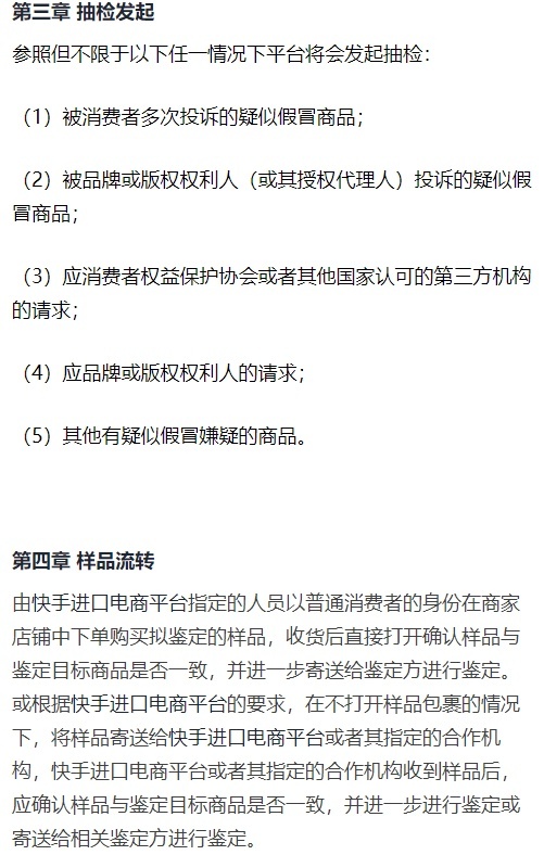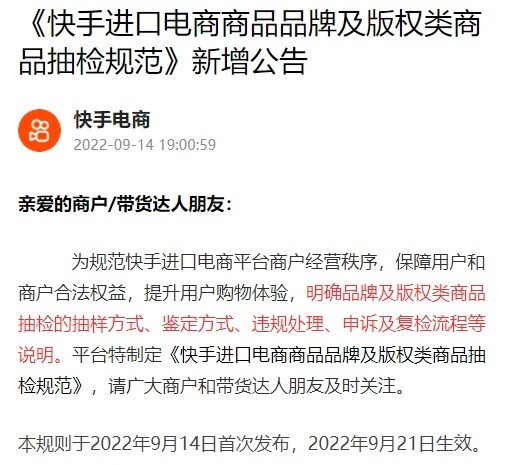 快手电商新增《快手进口电商商品品牌及版权类商品抽检规范》