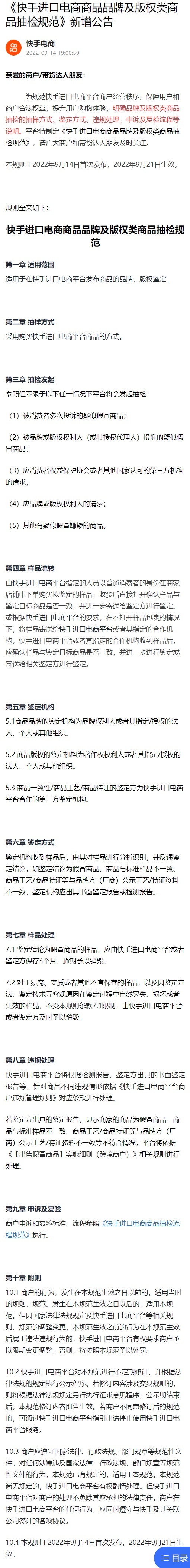 9月15日消息,快手电商发布公告称,为规范快手进口电商平台商户经营秩序,保障用户和商户合法权益,提升用户购物体验,明确品牌及版权类商品抽检的抽样方式、鉴定方式、违规处理、申诉及复检流程等说明。平台特制定《快手进口电商商品品牌及版权类商品抽检规范》,于2022年9月21日生效。