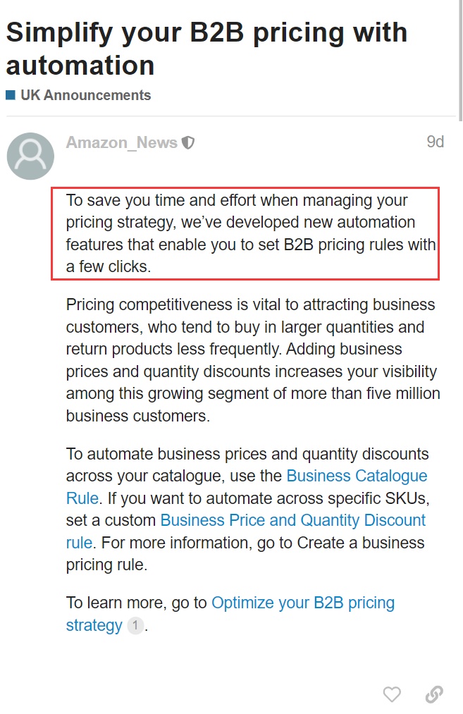 值得一提的是,近日,亚马逊欧洲站发布公告称,亚马逊开发了新的自动化功能,卖家只需单击几下即可设置B2B定价规则。